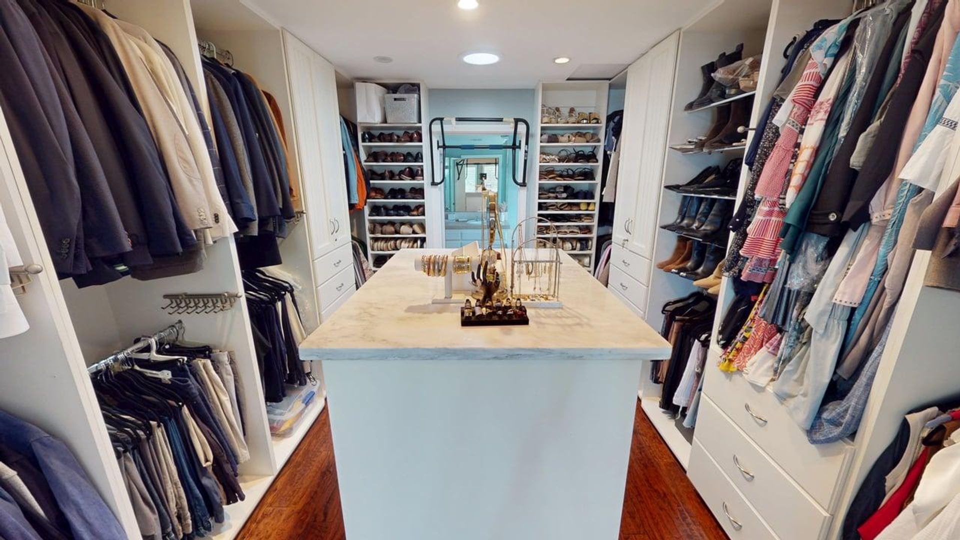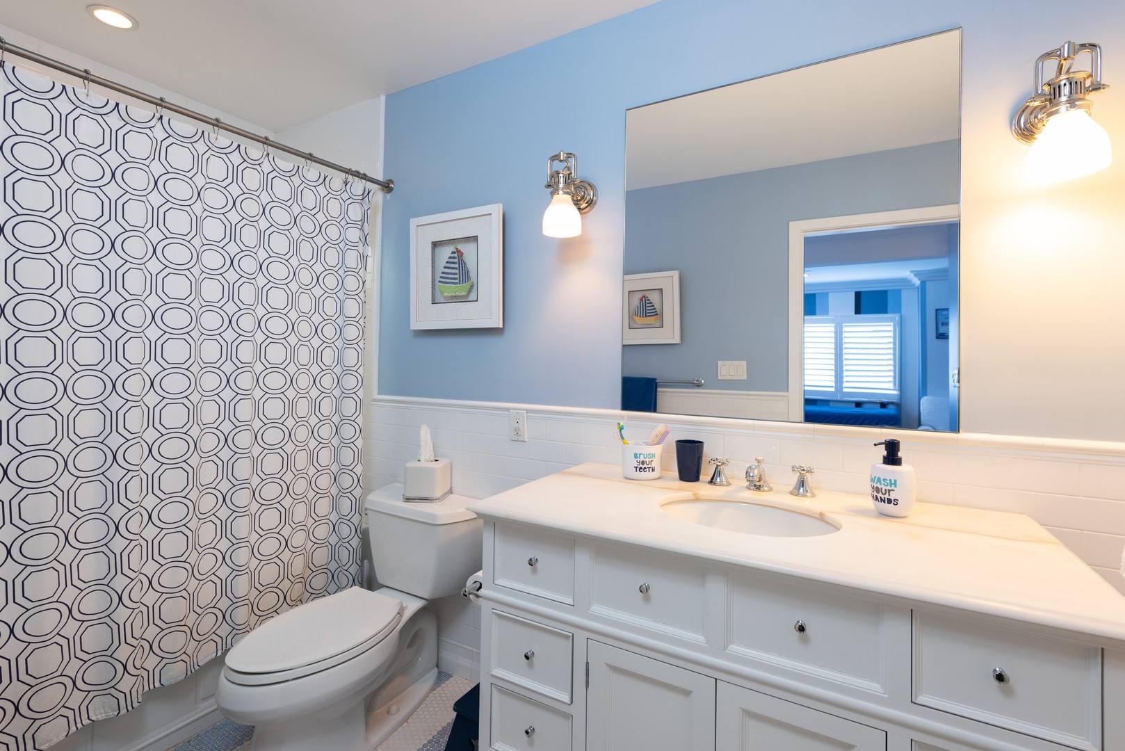 Upstairs, all three bedrooms are en suites. The spacious primary suite features a king bed, sitting area, built-in desk, large dressing closet, and a bathroom with a soaking tub, shower, and double vanity. The second upstairs bedroom includes two full beds, built-in desk space for two, walk in closet, and a private bathroom. The third upstairs bedroom has one queen bed and an en suite bathroom with a shower/tub combination.
