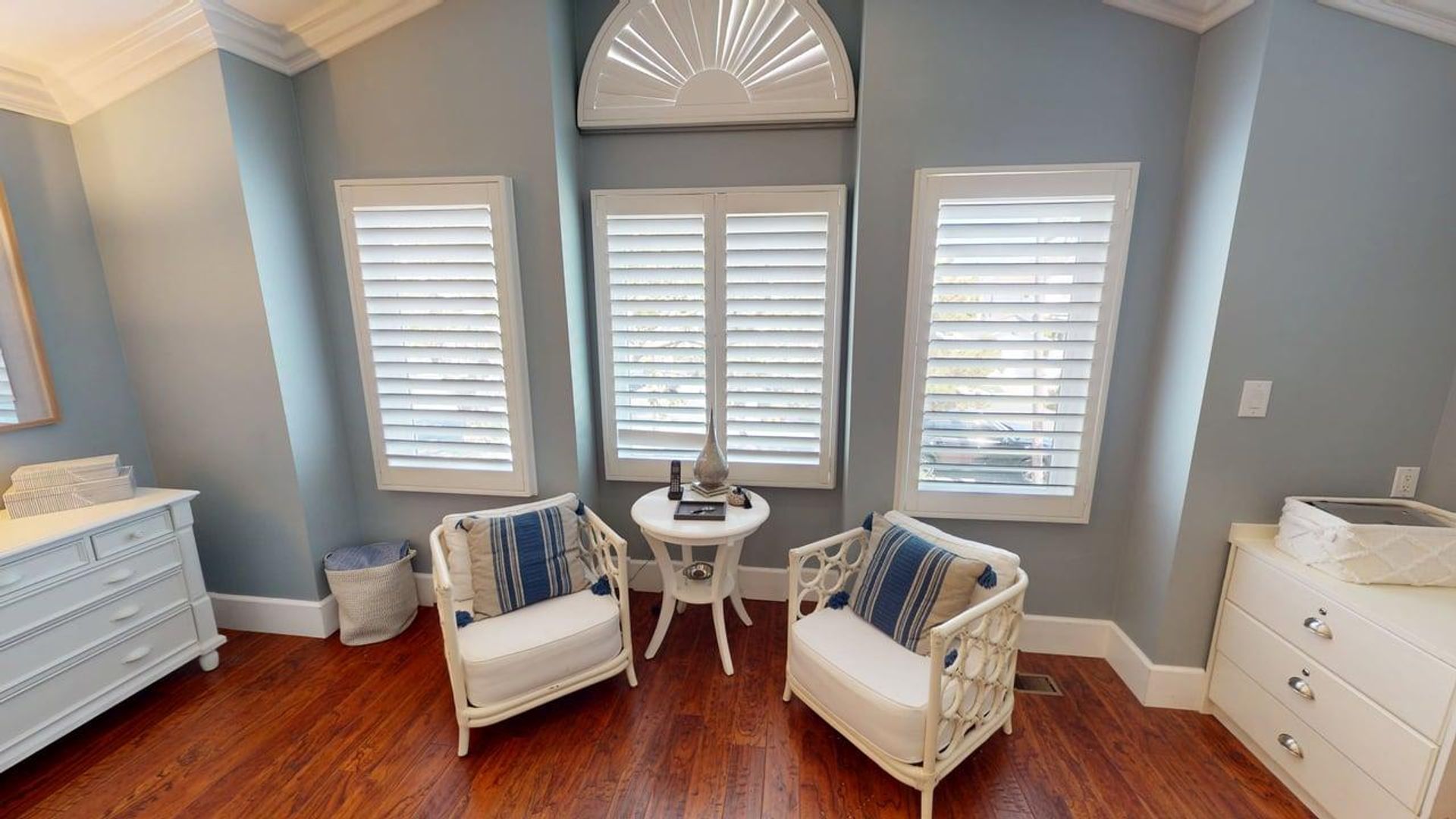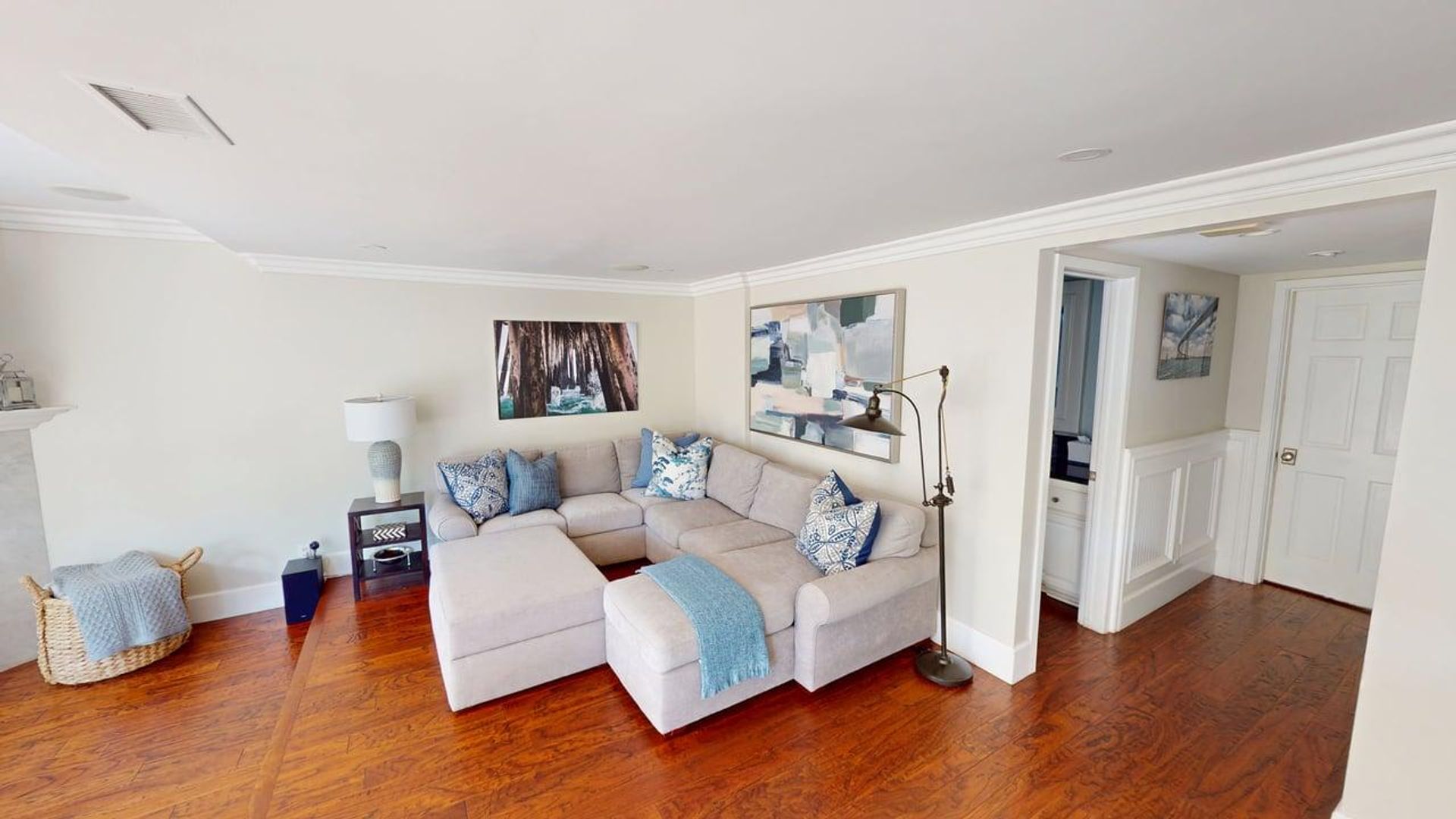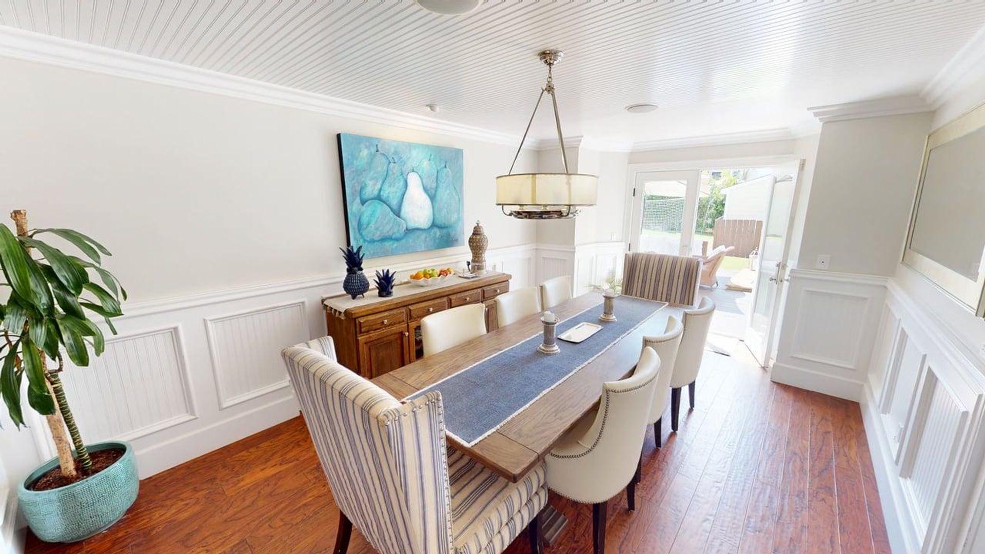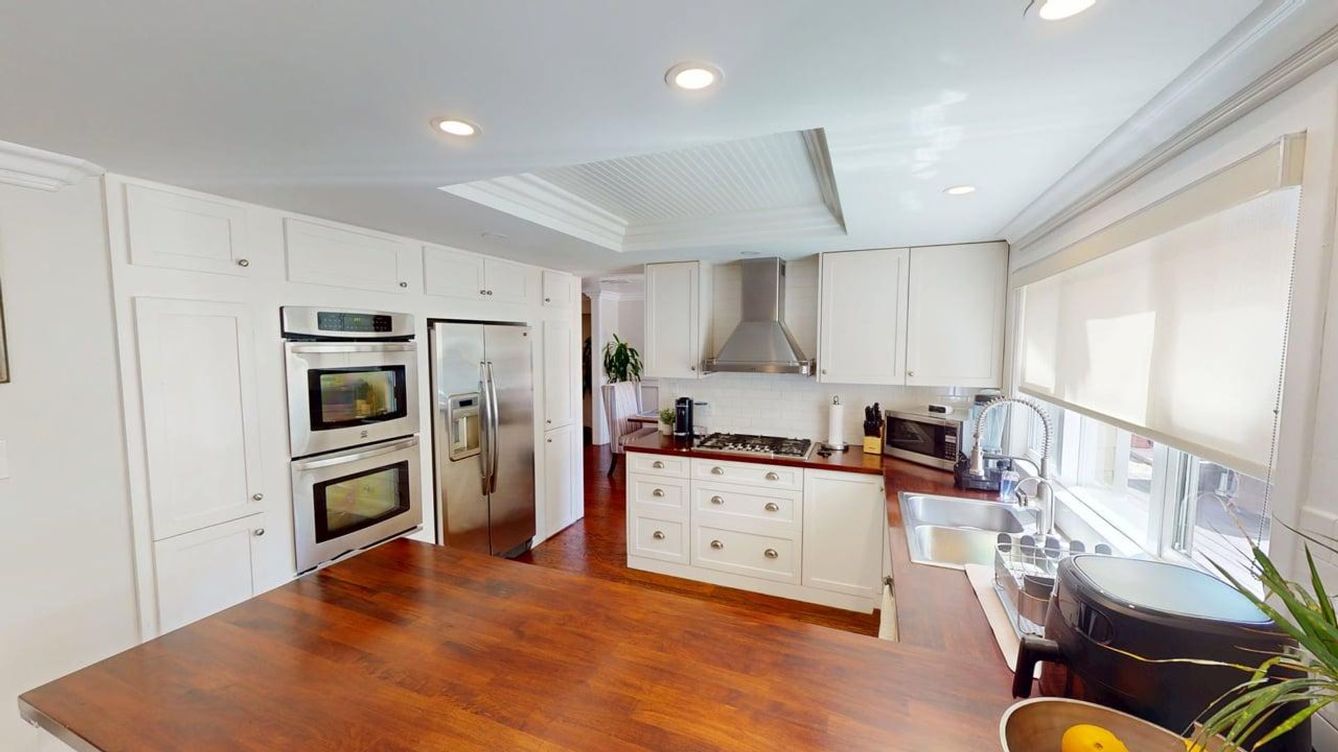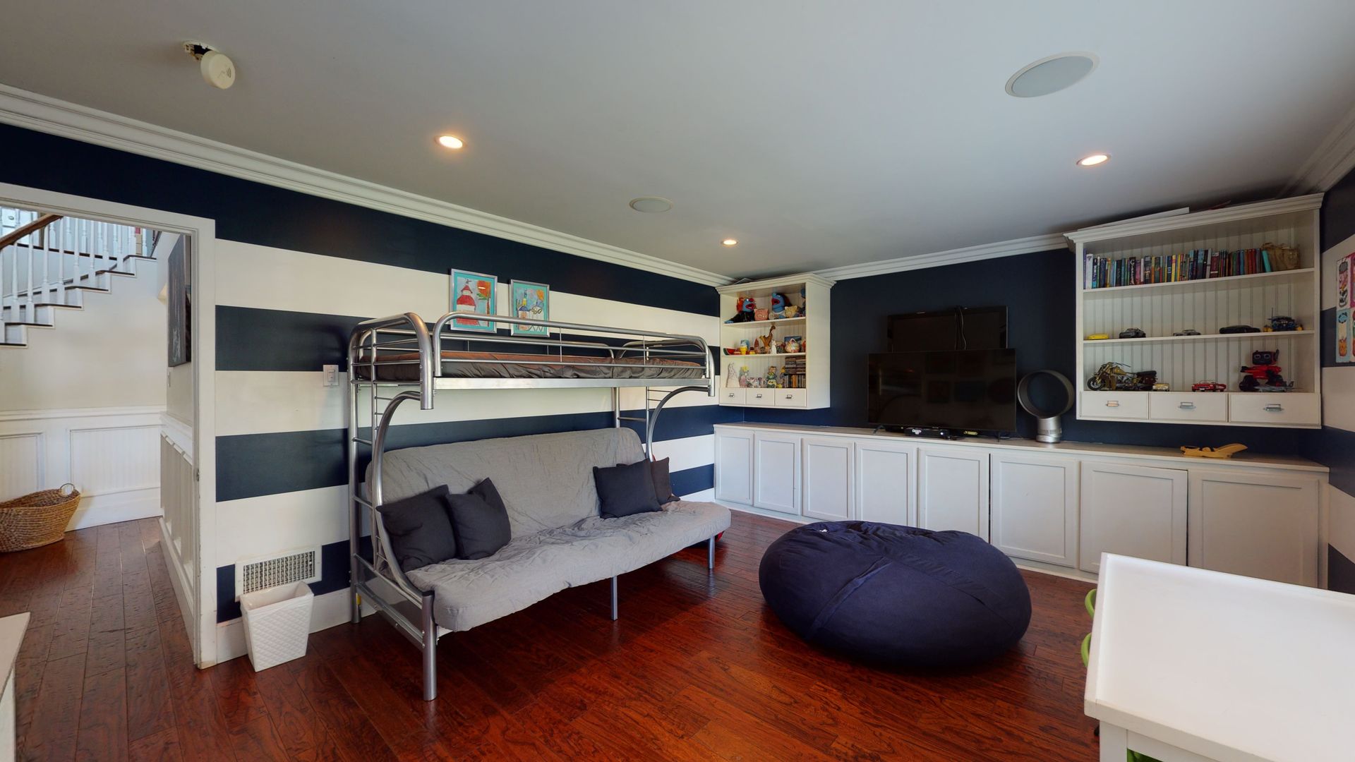 The main floor includes a formal living room, a family room with a fireplace and TV, and a gourmet kitchen with stainless steel appliances, a Nespresso machine, and two dining areas that can seat up to 14 guests. Two bedrooms are located on the first floor—one with a full bed and the other (formerly a playroom) with a bunk bed, ideal for children.