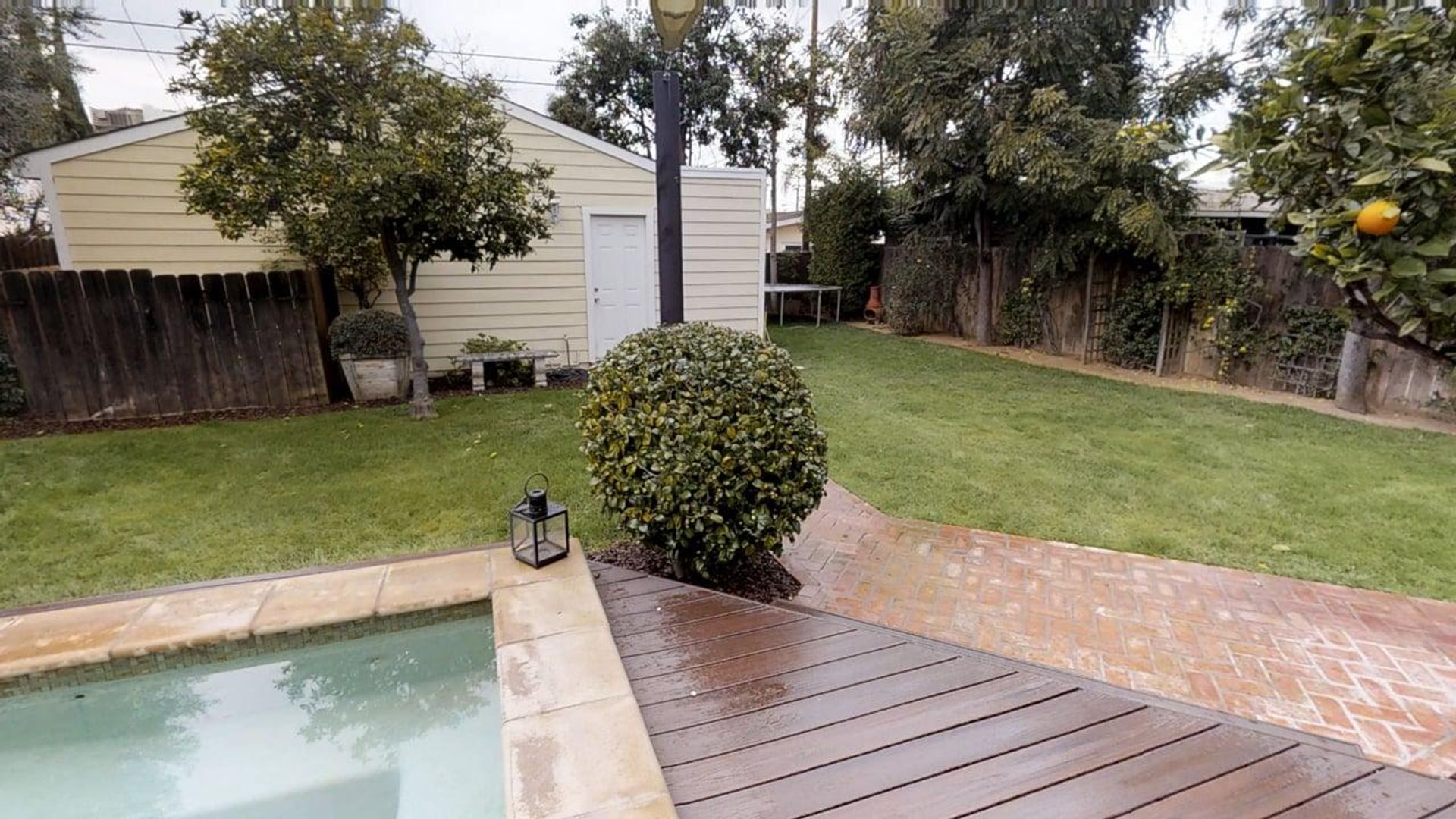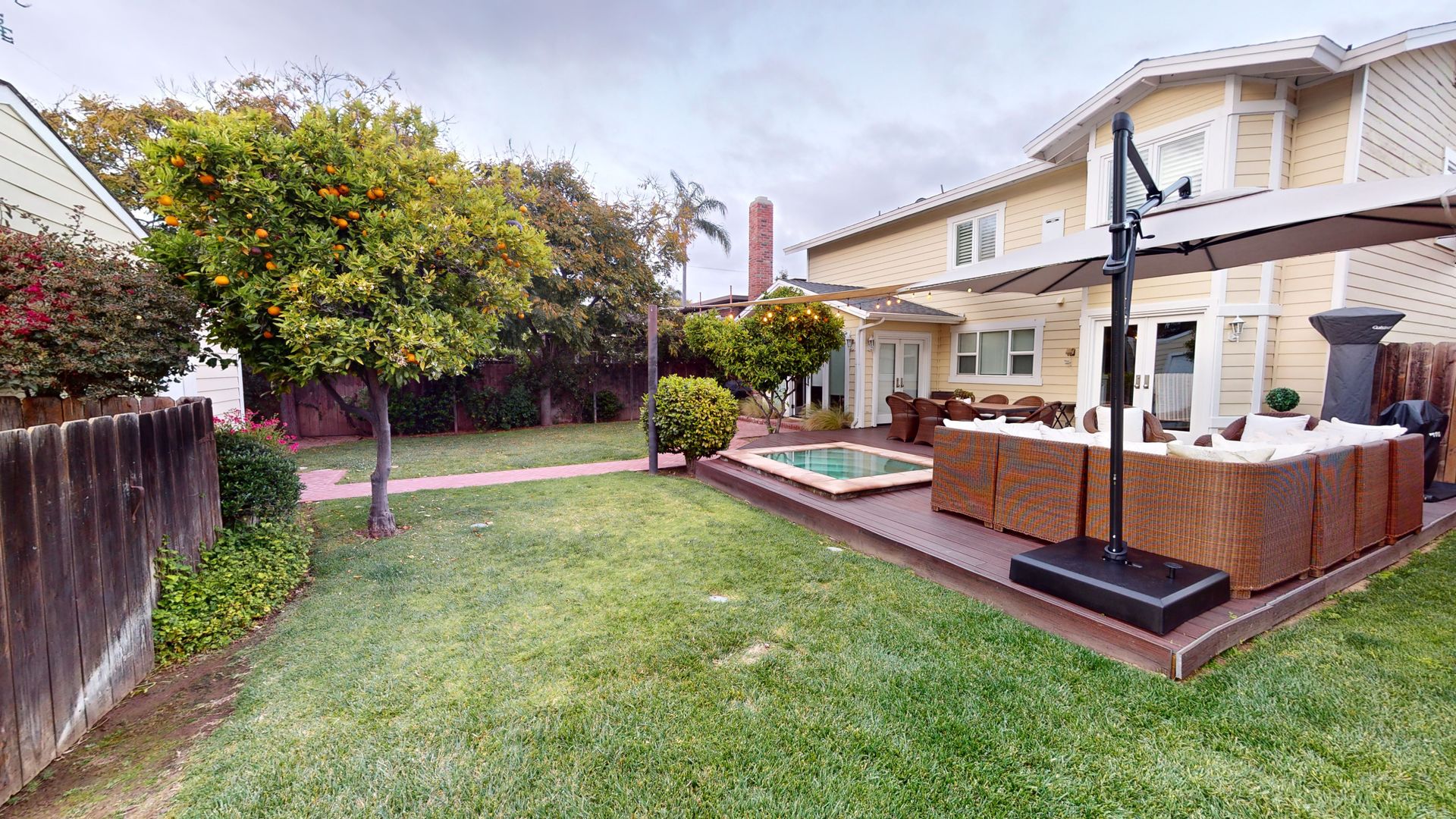 The backyard is designed for outdoor living with a large deck, comfortable seating, a dining table for eight, a built-in spa, a professional-grade trampoline, and a BBQ grill. The detached studio, located next to the garage, includes a twin bed and private bathroom. Parking includes one space in the garage and one space behind it. Laundry is located in the garage. The home is fully stocked with recreational gear including golf bags, tennis racquets, surfboards, boogie boards, fishing rods, beach chairs, towels, umbrellas, and more.