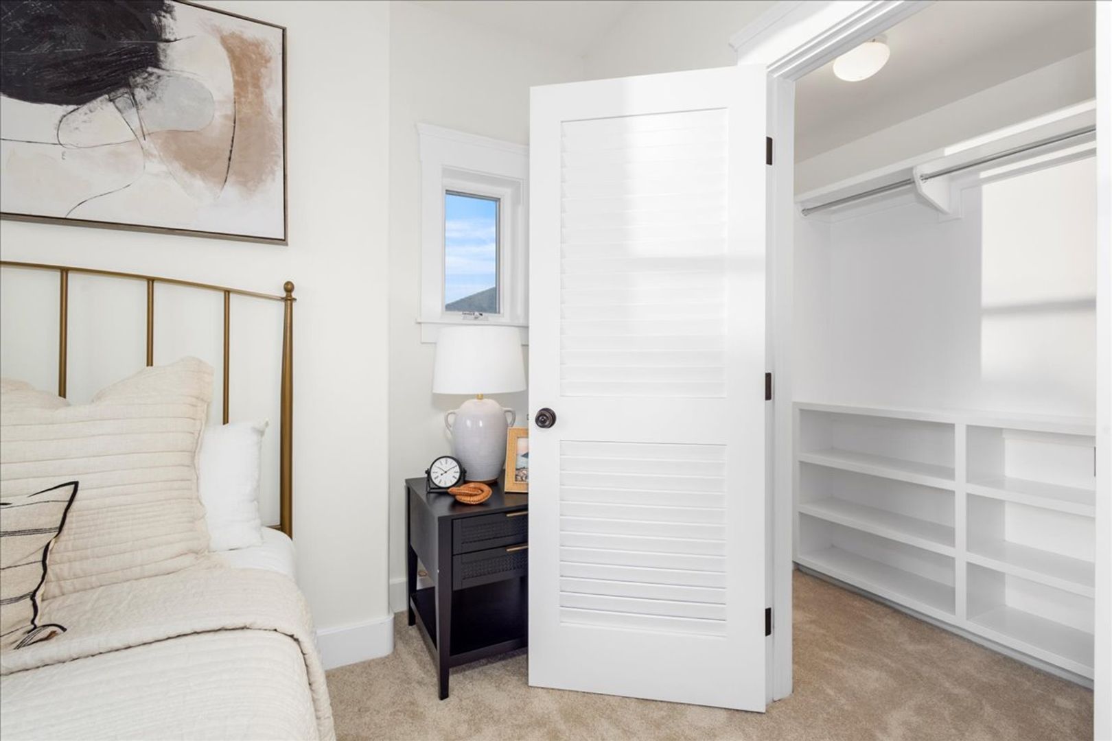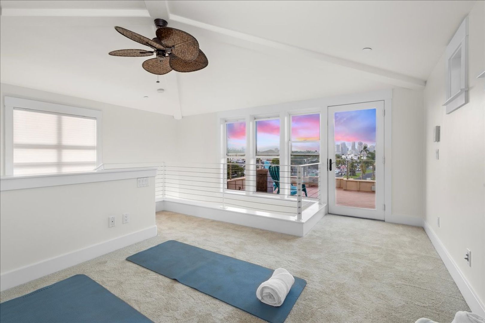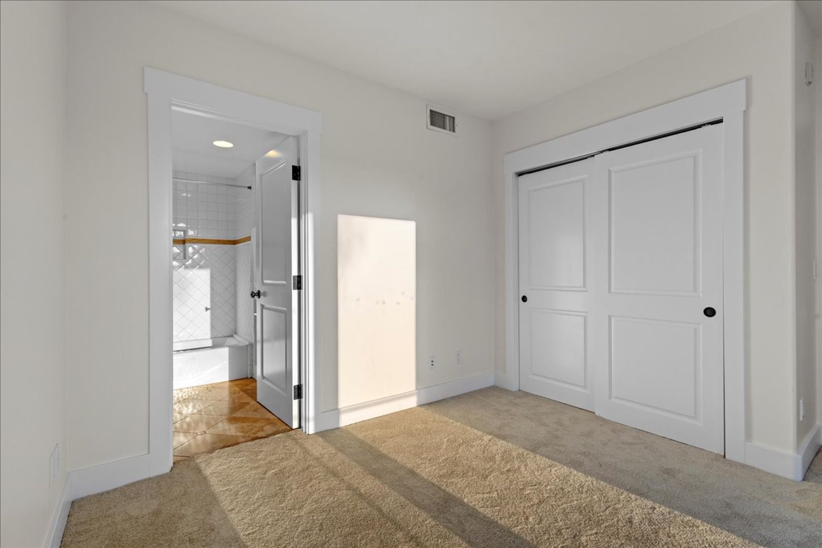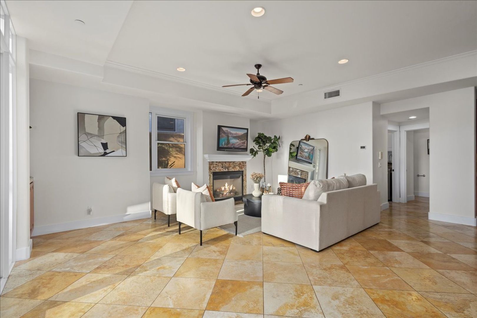 The home features several well-placed outdoor spaces that complement the layout. Just off the living room, a private patio creates an easy extension of the main living area—ideal for dining, grilling, or relaxing. A smaller sitting patio off a second-floor bedroom offers a quiet outdoor retreat, while the rooftop deck off the loft above the primary suite provides views toward downtown and a more elevated place to unwind.
