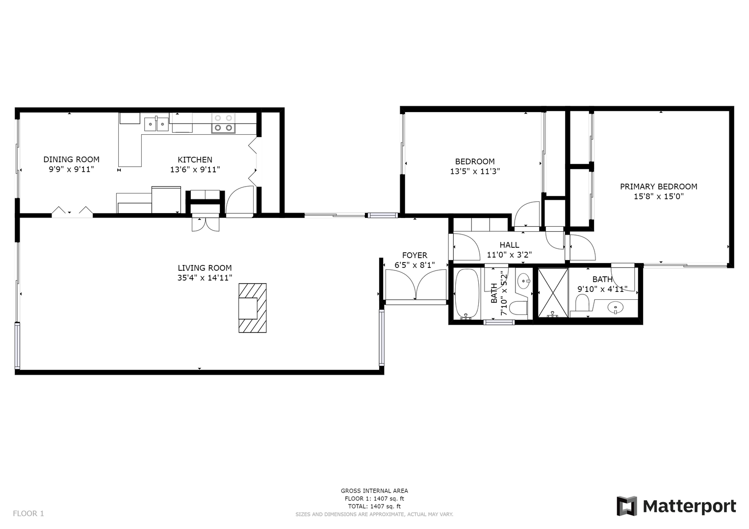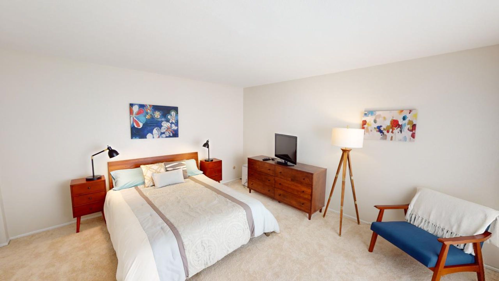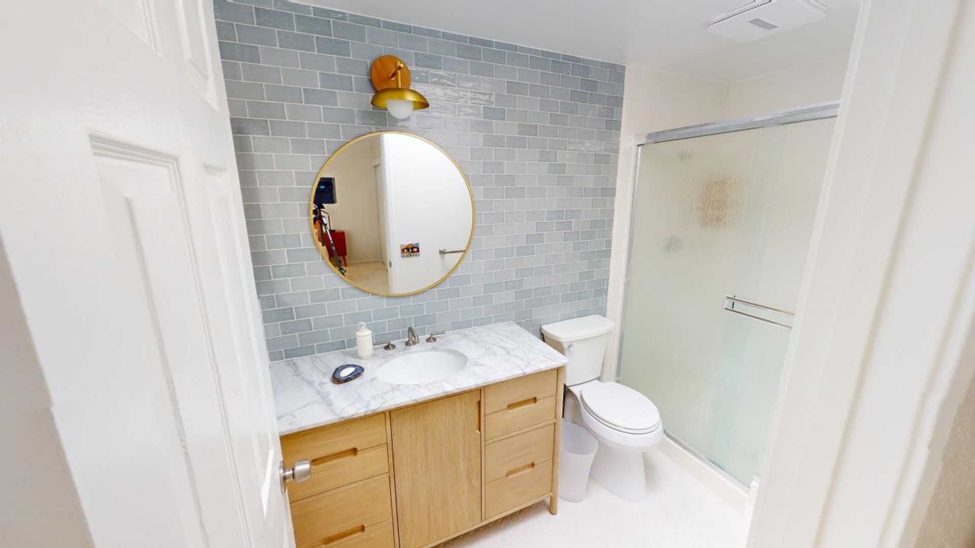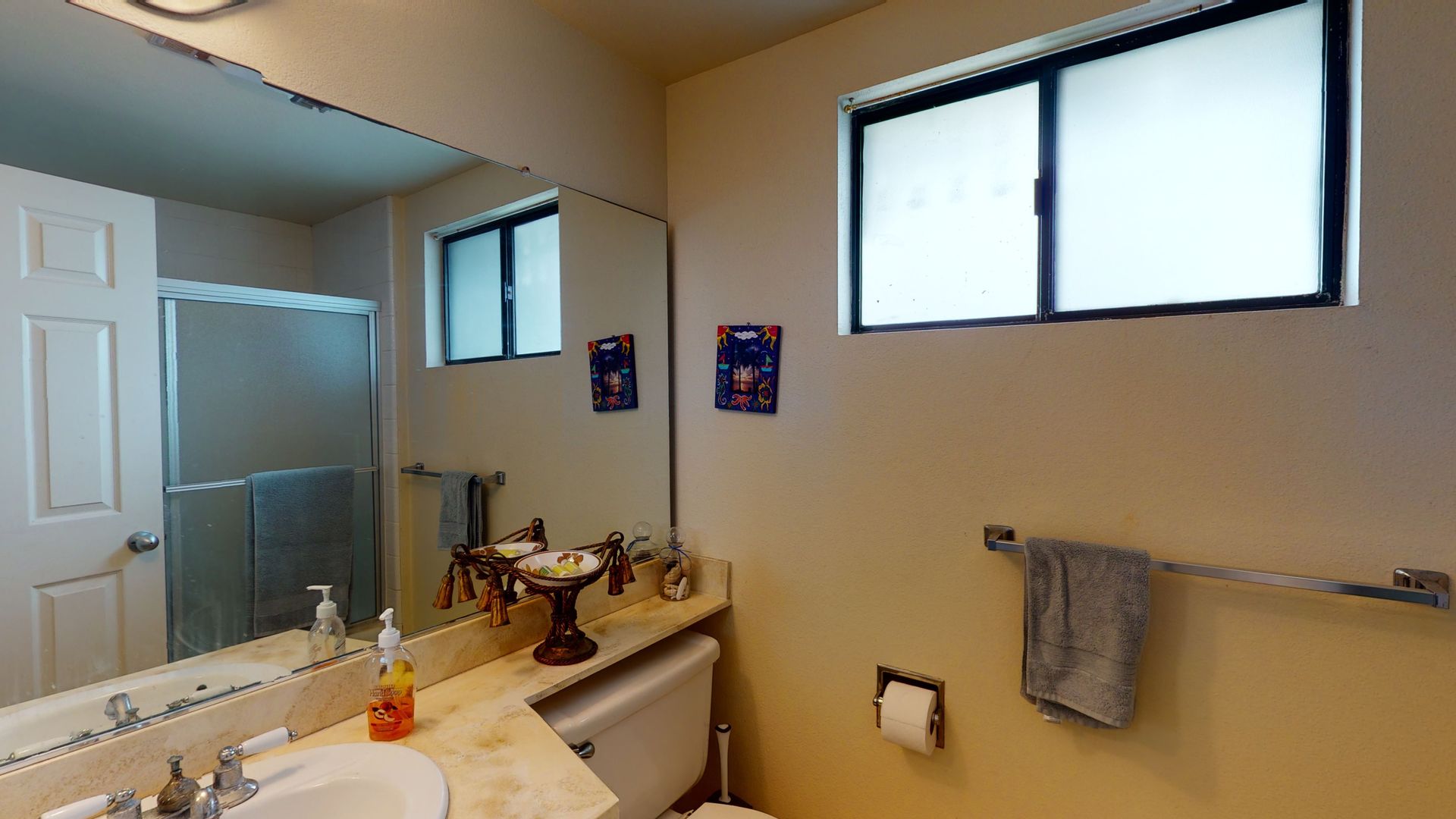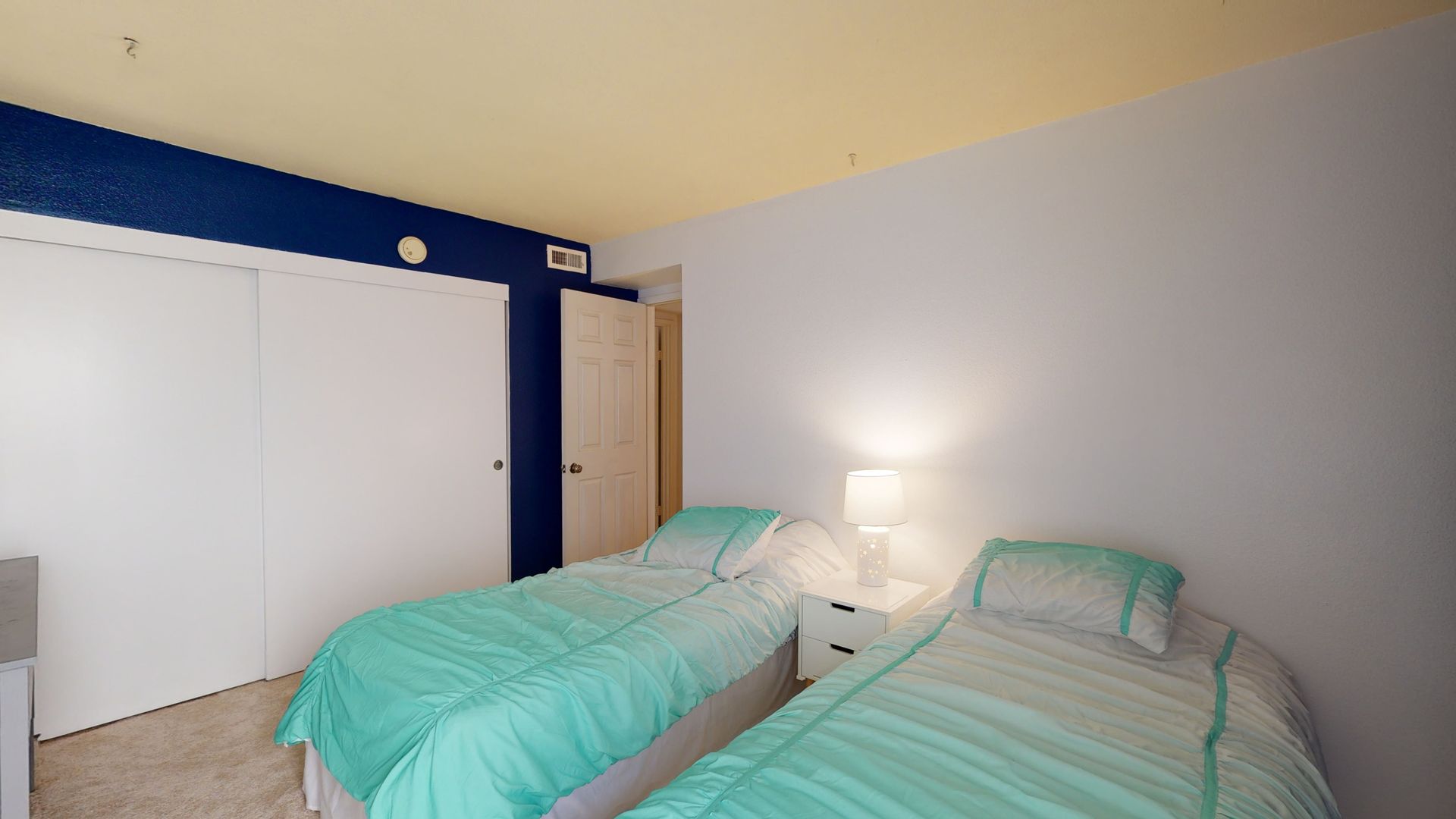 The first bedroom includes two twin sized beds, a large window, and ample closet space. The first bathroom includes a spacious vanity and bathtub/shower combo with glass doors.