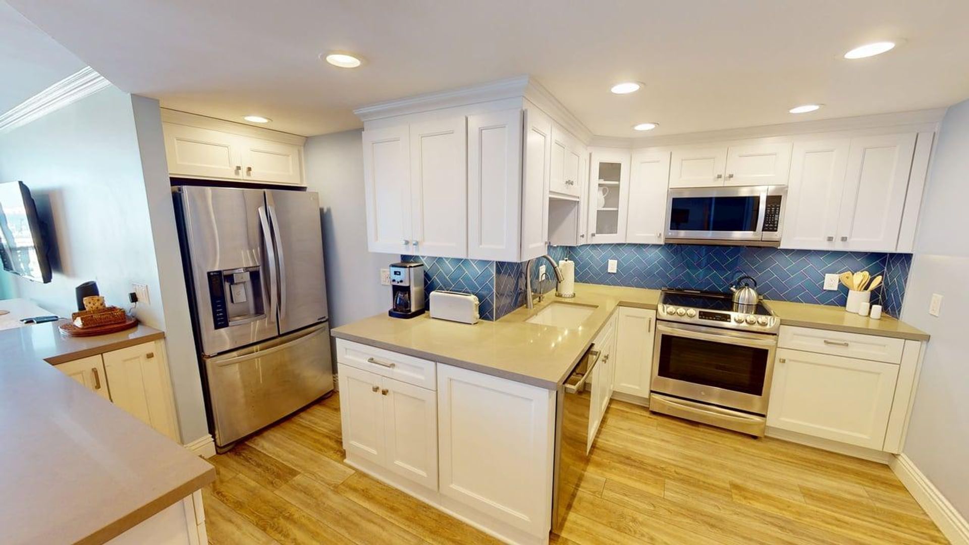 The private patio is the perfect place to enjoy the Fourth of July fireworks over Glorietta Bay, with front-row views and an electric grill for effortless outdoor dining. Inside, the fully stocked kitchen has everything you need to prepare meals at home—from cookware and utensils to small appliances.