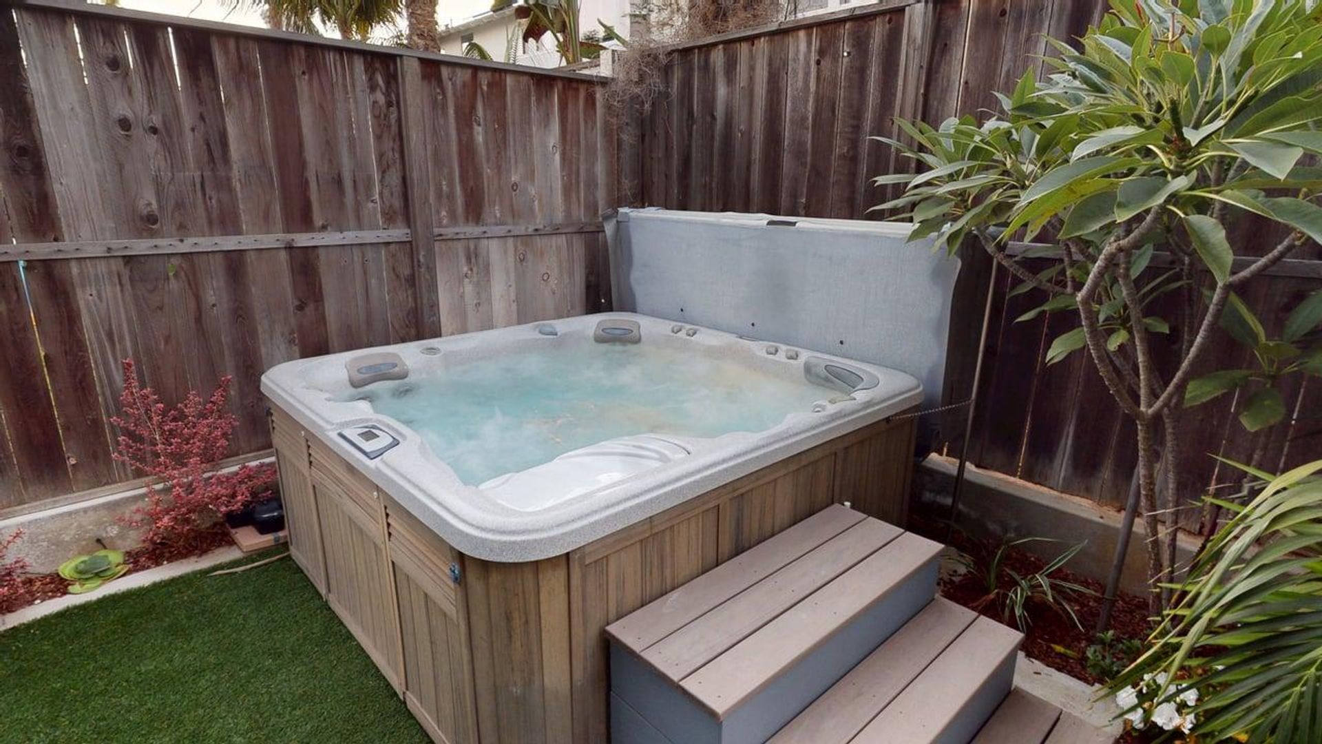 Outside, the expansive covered patio functions as a resort-style retreat with multiple spaces to lounge, dine, and unwind. A tranquil waterwall feature with softly shifting colored lights adds a calming focal point and an elevated evening ambiance. A second stone fireplace with a mounted TV sets the tone for cozy gatherings, while overhead heaters keep the space comfortable year-round. Stand-alone cooking amenities including a BBQ, smoker, and pizza oven make alfresco dining effortless. After a day at the beach or a sunset bike ride, slip into the spa, surrounded by lush landscaping that enhances privacy and atmosphere.
