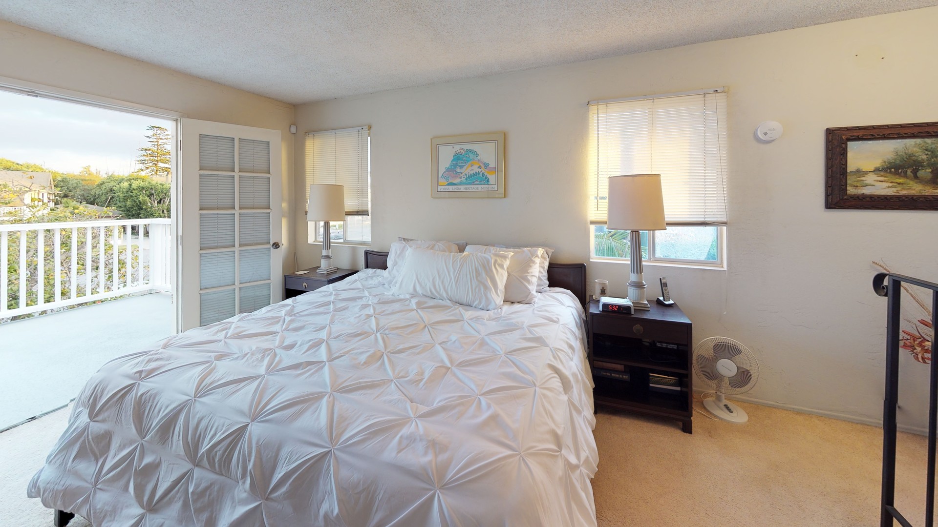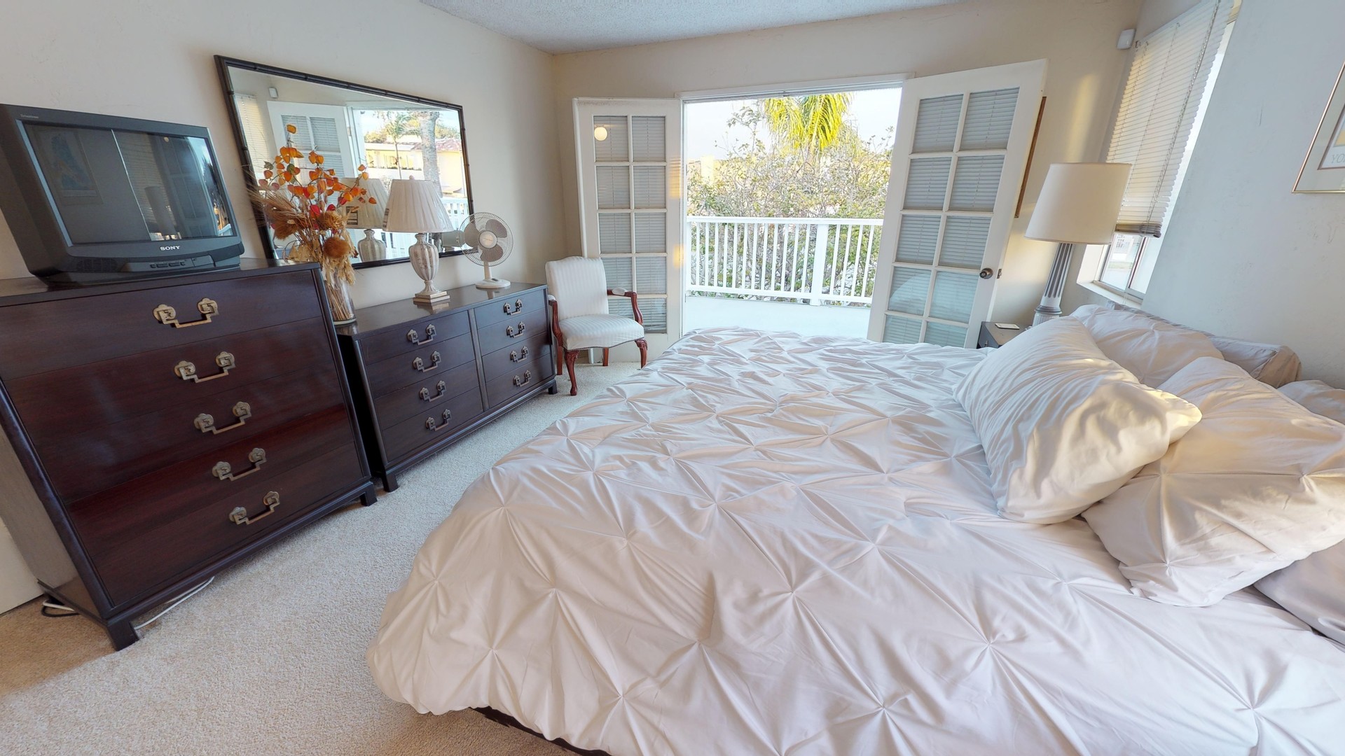 The master bedroom is located on the second level and has a king bed to sleep 2. French doors lead out to a large balcony to enjoy the sunshine and beach breezes. The second bedroom is located on the first floor and has two twin beds which merge together to form a king-sized bed. Both full bathrooms are located on the first floor and include a sink, vanity, toilet and shower over tub.